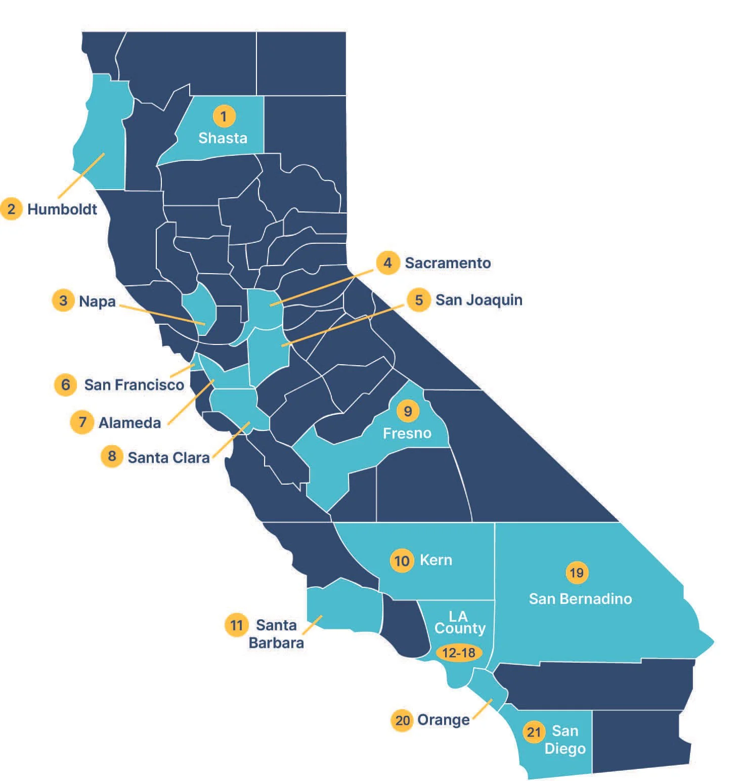 Far Northern Regional CenterRedwood Coast Regional CenterNorth Bay Regional CenterAlta California Regional CenterValley Mountain Regional CenterGolden Gate Regional CenterRegional Center of the East BaySan Andreas Regional CenterCentral Valley Regional CenterKern Regional CenterTri-Counties Regional CenterRegional Centers in LA County:Eastern Los Angeles Regional CenterFrank D. Lanterman Regional CenterHarbor Regional CenterNorth Los Angeles County Regional CenterSan Gabriel / Pomona Regional CenterSouth Central Los Angeles Regional CenterWestside Regional CenterInland Regional CenterRegional Center of Orange CountySan Diego Regional Center